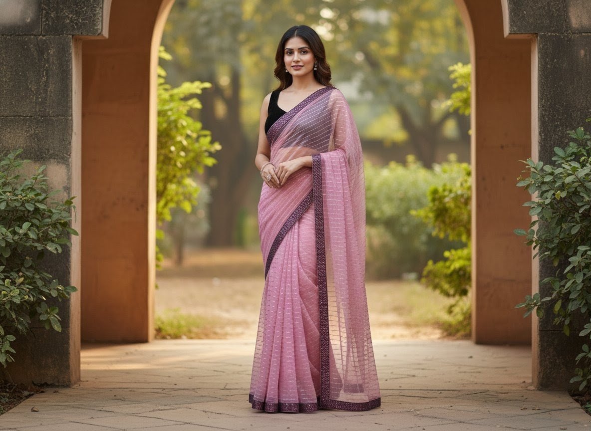 Beautiful Pink Net Saree with Black Velvet Blouse for Parties