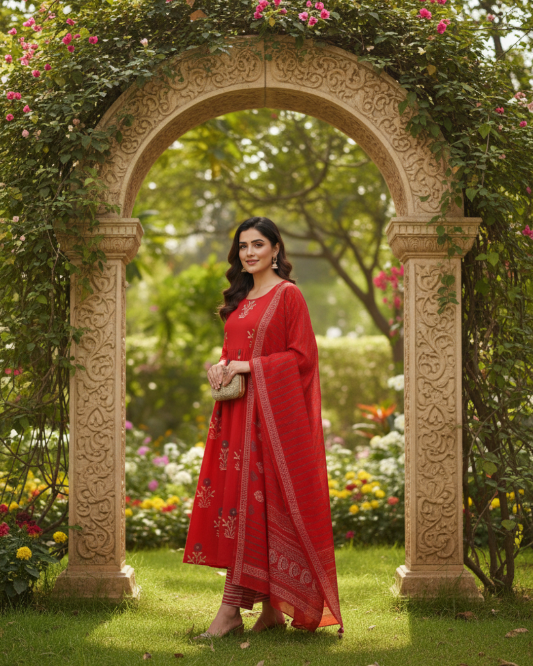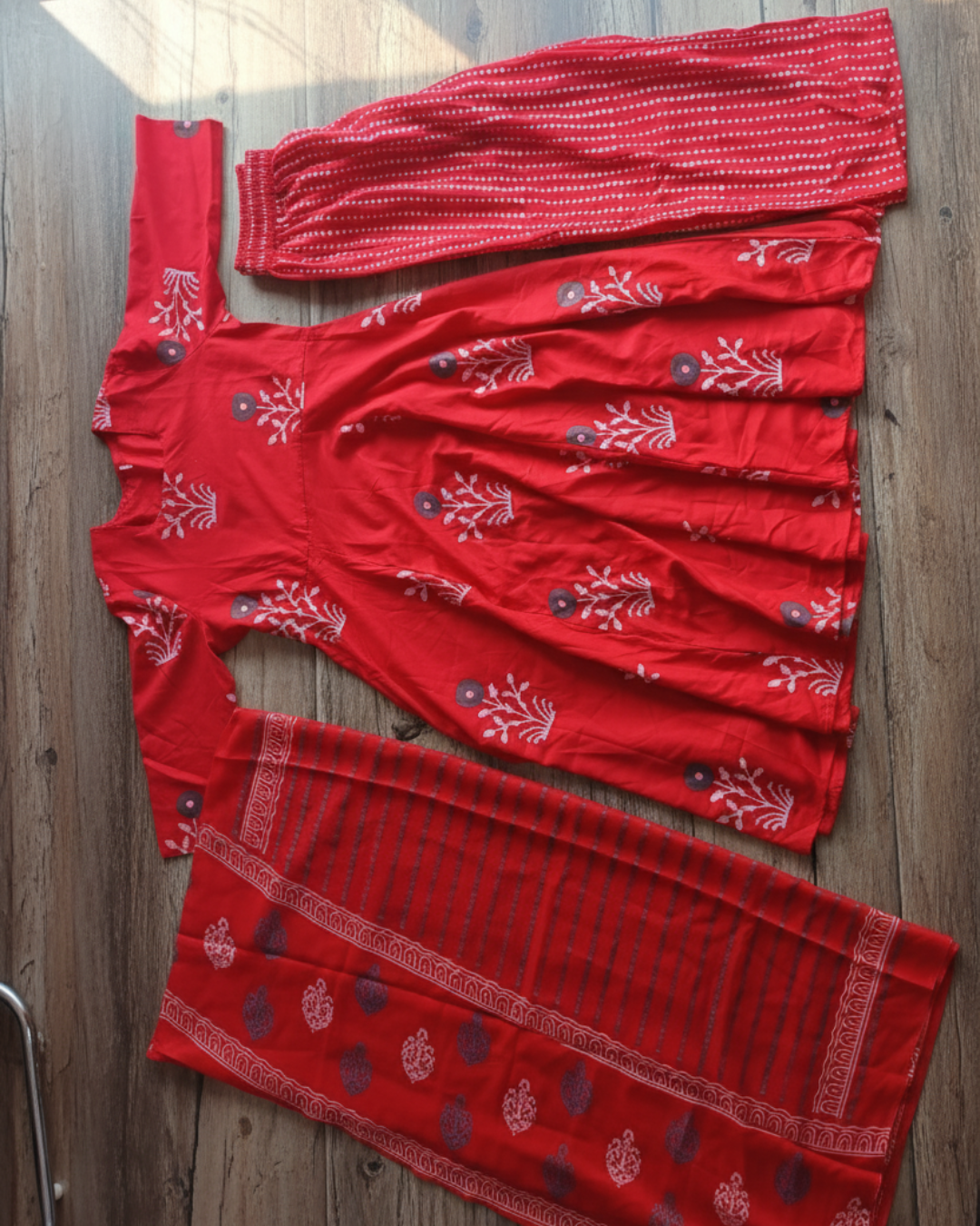 Ready to Wear 3 Pc Red Cotton Printed Gown