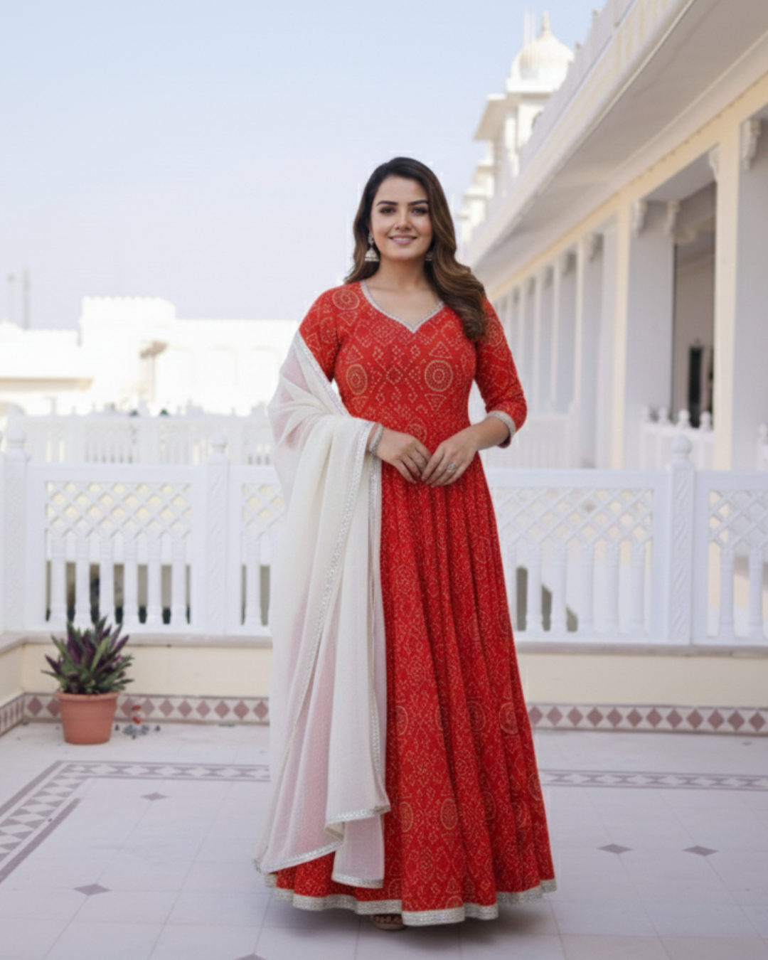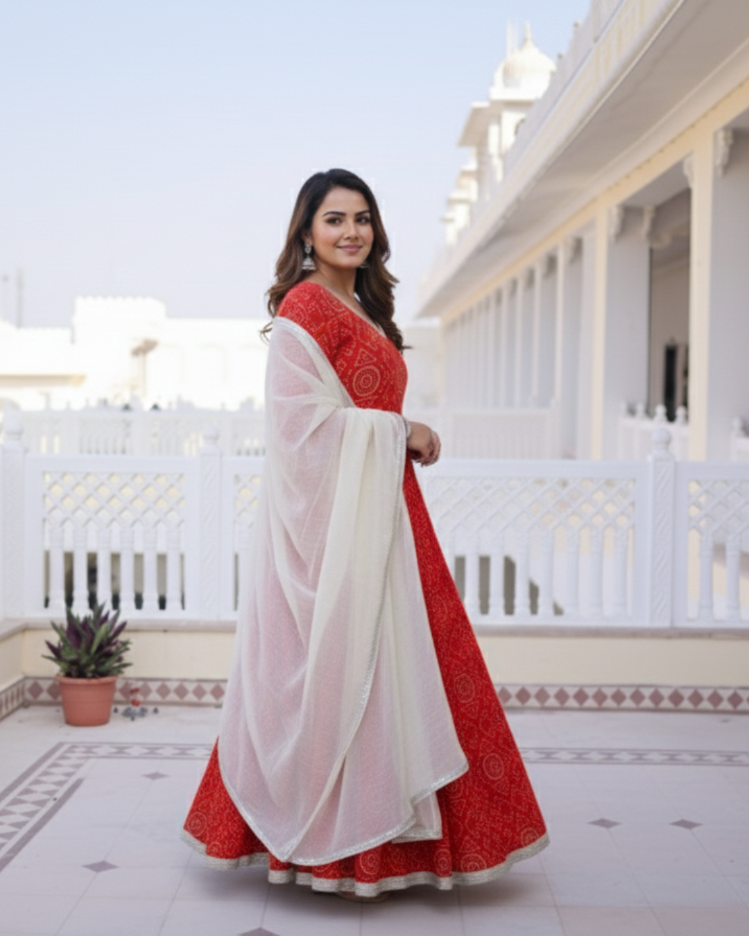 Red Bhandej Printed Anarkali Gown with Gotta Lace Work DupattaRed Bhandej Printed Anarkali Gown with Gotta Lace Work Dupatta